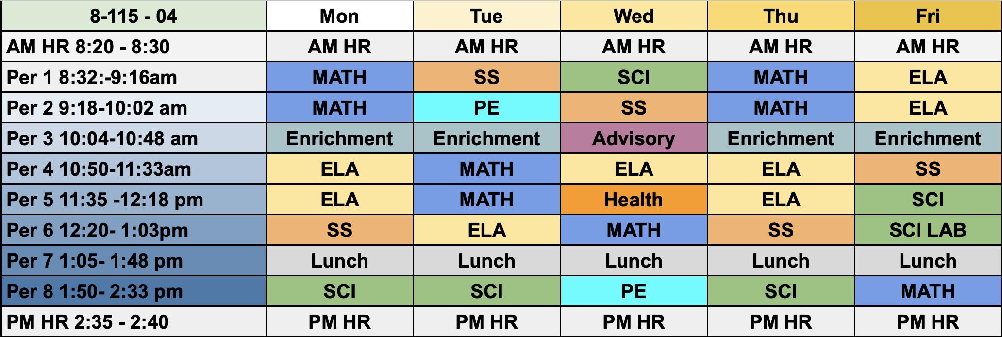 If you forget your schedule, it is posted by homeroom at the bottom of this page. Classes will start at 8:30am, there is no AM Homeroom.